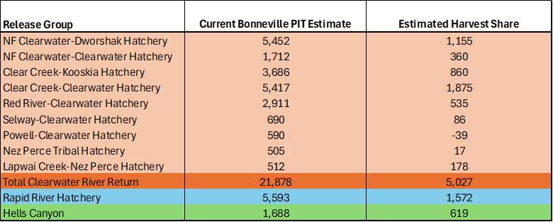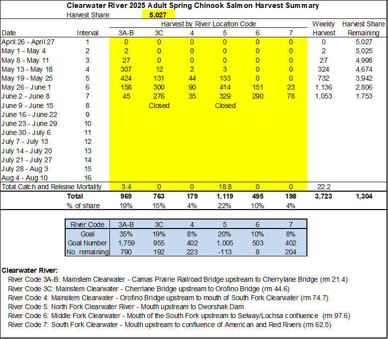 The Clearwater Region’s spring Chinook Salmon fisheries update is comparatively brief this week. A few changes occurred since last week’s update. The Clearwater River from Cherrylane Bridge upstream to Orofino Bridge and the North Fork Clearwater River are now closed for spring Chinook Salmon. The Fish and Game Commission approved the summer Chinook Salmon season on the Lochsa and increased the season limit for adult Chinook Salmon to 20 fish.